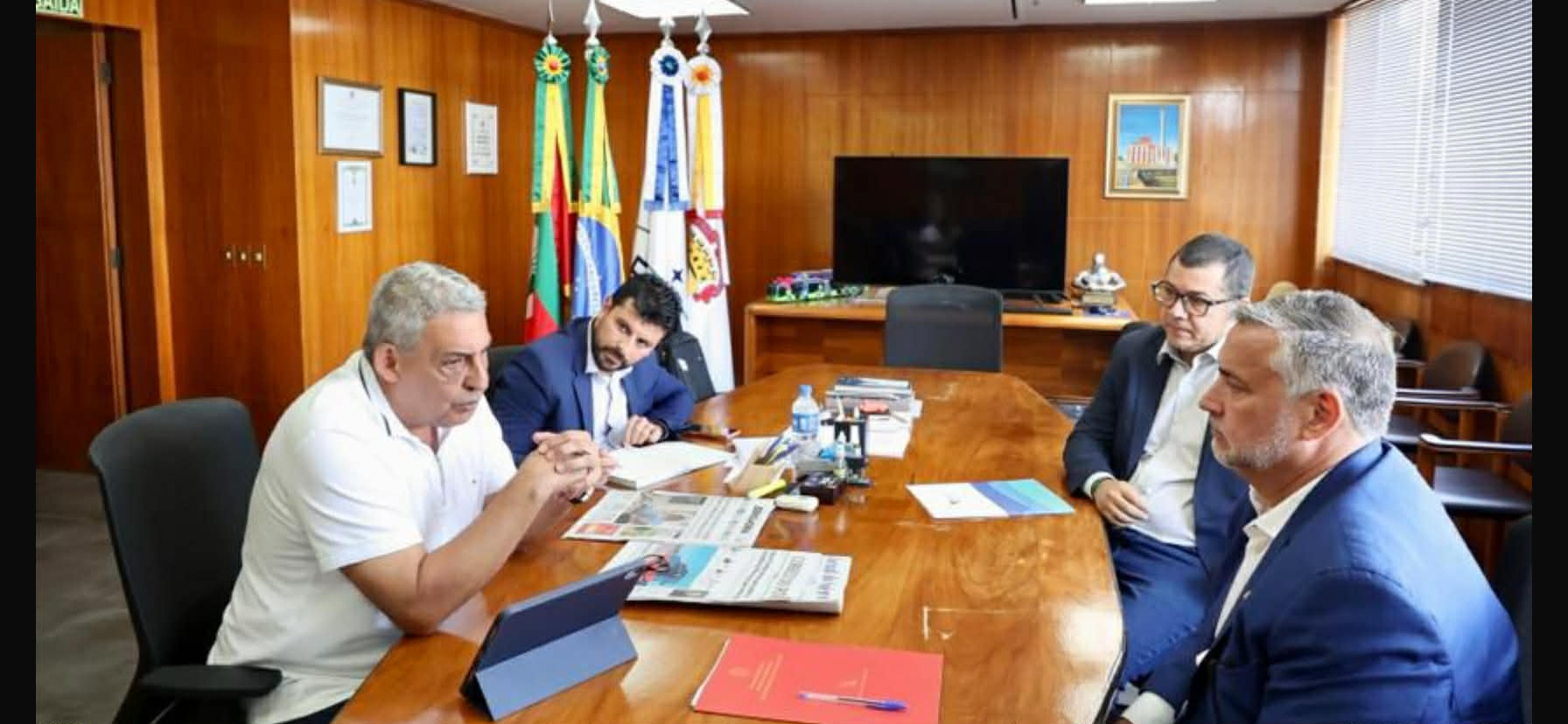 O prefeito de Porto Alegre, Sebastião Melo, conseguiu avançar em algumas agendas ligadas ao governo Federal. Foi ontem durante reunião em seu gabinete com o deputado federal Paulo Pimenta, o Superintendente do Patrimônio da União no Rio Grande do Sul, Émerson Rodrigues e o jornalista Voltaire Santos. A pauta tratou das obras de proteção contra cheias em Porto Alegre. Segundo o prefeito, “ficou acertado que na semana que vem, vamos realizar uma vistoria junto com representantes do Governo Federal em pontos estratégicos, entre eles, a alça de acesso da ponte do Guaíba, o Arroio Areia e as áreas dos pôlderes 7 e 8 – que vão servir para proteção de enchentes na zona norte e Aeroporto Salgado Filho”.
