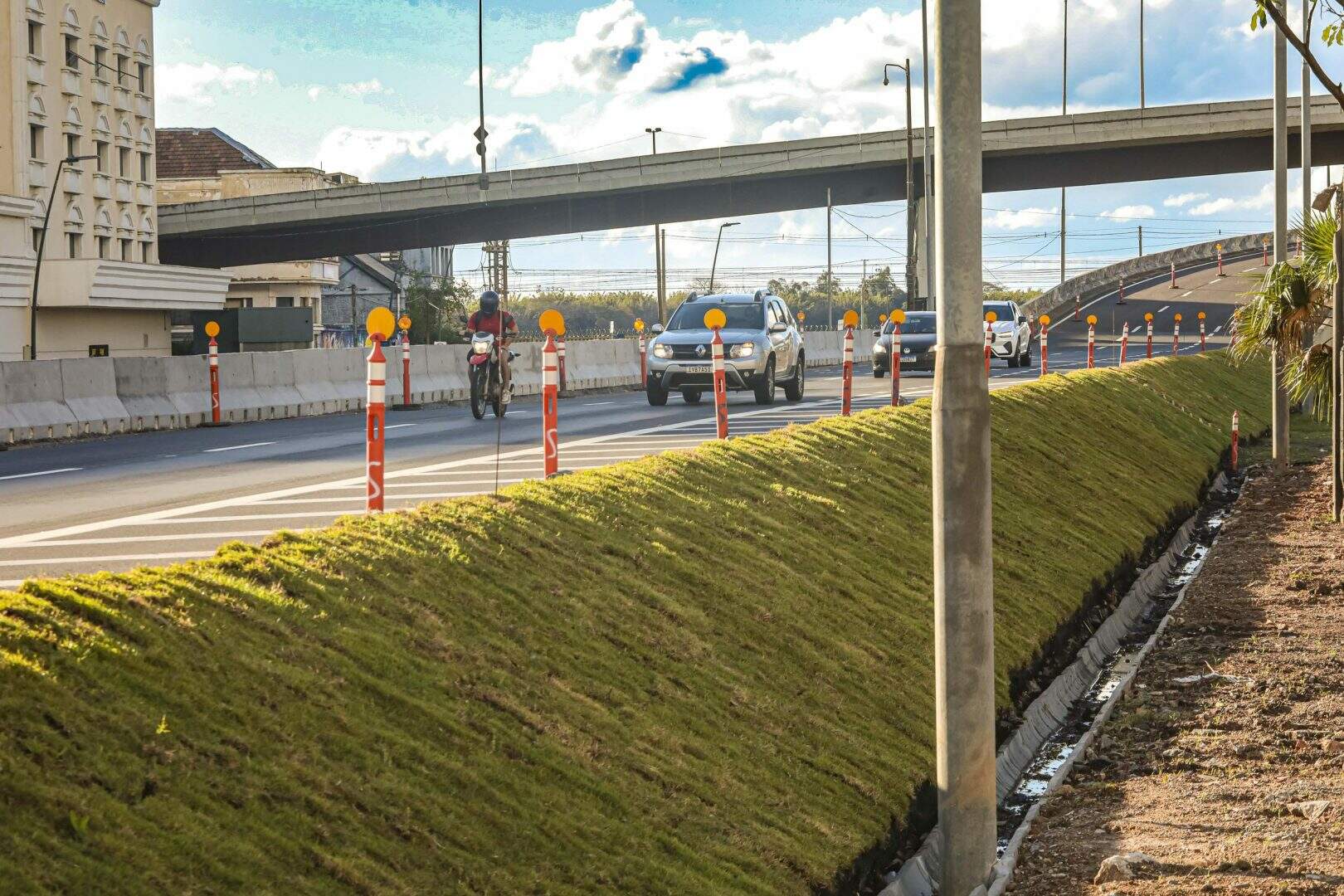Também será realizado plantio de grama no talude (estrutura lateral de contenção). Barreiras do tipo “New Jersey” já estão instaladas ao longo de todo segmento, com o objetivo de indicar o fluxo de veículos e proteger a via, além de impedir a travessia irregular de pedestres.