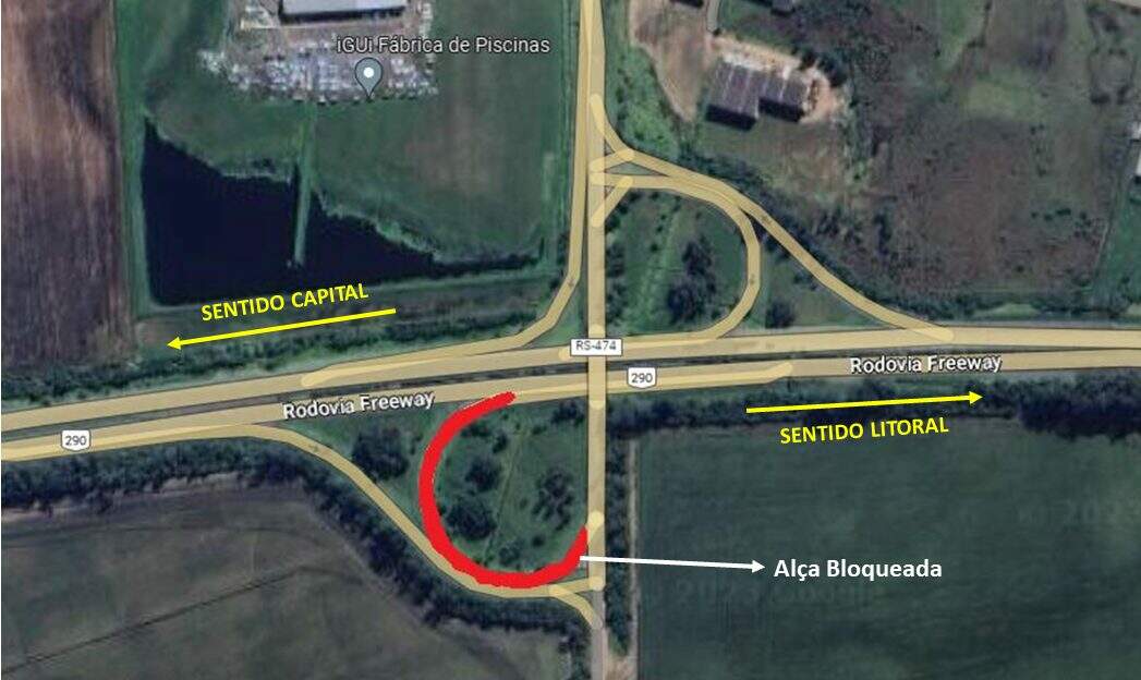 A partir da 1h deste sábado (11), a CCR ViaSul fará o bloqueio parcial da alça de acesso na altura do km 25 da pista Leste, sentido litoral, em Santo Antônio da Patrulha, no Rio Grande do Sul, devido à realização de obras no pavimento. O local serve como ligação à Freeway para quem vem da ERS-474.