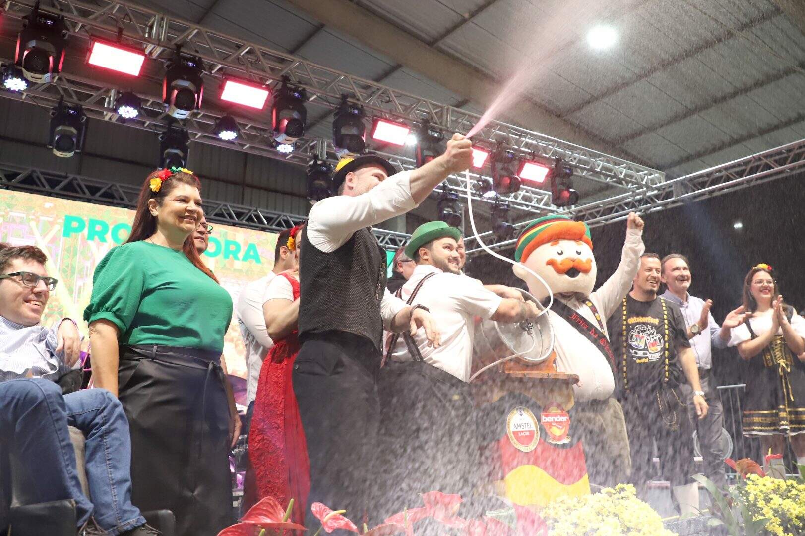A Oktoberfest de Esteio começou em grande estilo na noite desta quinta-feira (23), com a tradicional sangria do barril e um banho simbólico de chope no público, marcando oficialmente a abertura da festa no Parque Estadual de Exposições Assis Brasil. O ato foi conduzido pelo prefeito Felipe Costella e pelo secretário municipal de Cultura, Esporte e Lazer, Brayon Marques, diante de uma plateia animada que lotou o Pavilhão da Agricultura Familiar.