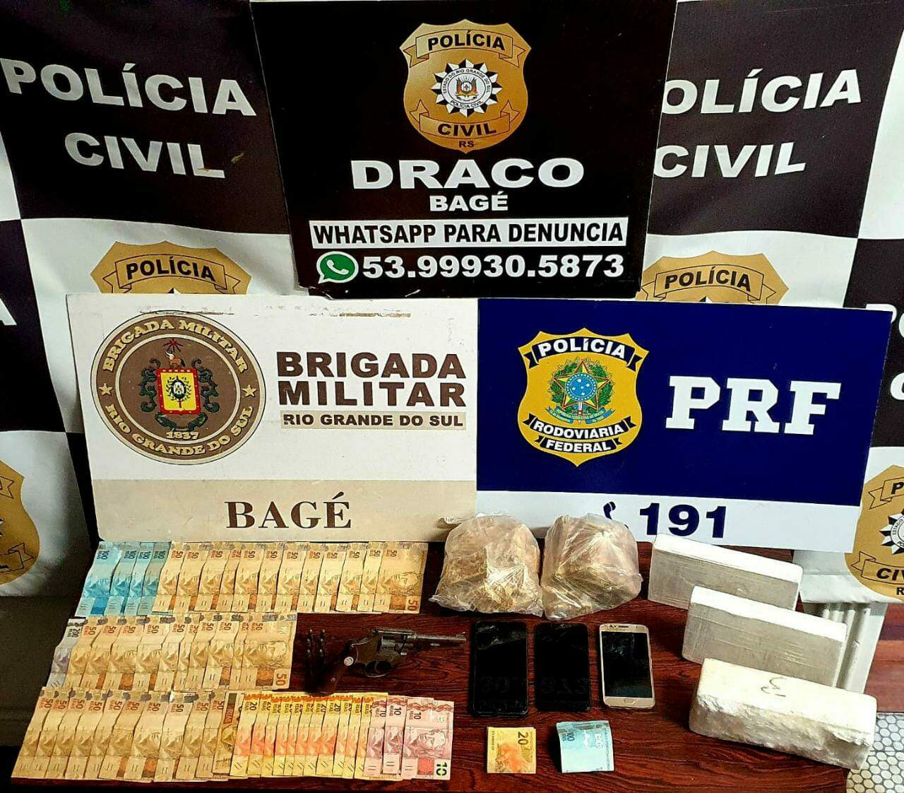 A PRF (Polícia Rodoviária Federal), a Polícia Civil e a Brigada Militar (Setor de Inteligência de Bagé) prenderam, nesta quarta-feira (10), três pessoas e apreenderam cocaína, crack, maconha, um revólver e munições em Bagé, na Região da Campanha. A ação iniciou na BR-293 e terminou em um bairro da cidade.