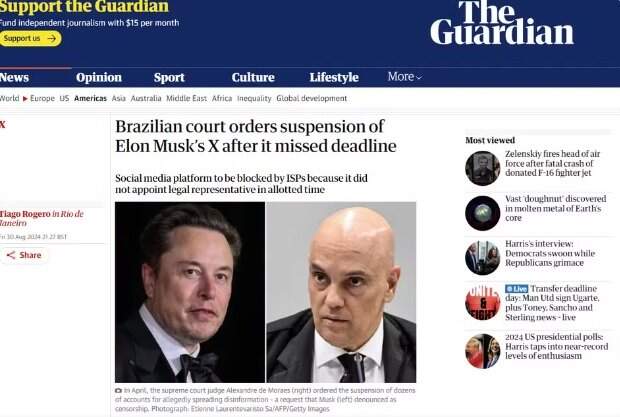 O jornal britânico afirmou que o STF determinou a suspensão do X no país após a rede social não cumprir com o prazo para indicar um representante legal no Brasil.