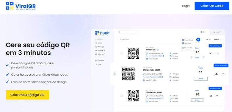 • ViralQR criação de QR Code dinâmicos personalizáveis e completos, com ampla capacidade de rastreamento detalhado (cidade e outros dados) e recursos profissionais para fins pessoais e empresariais