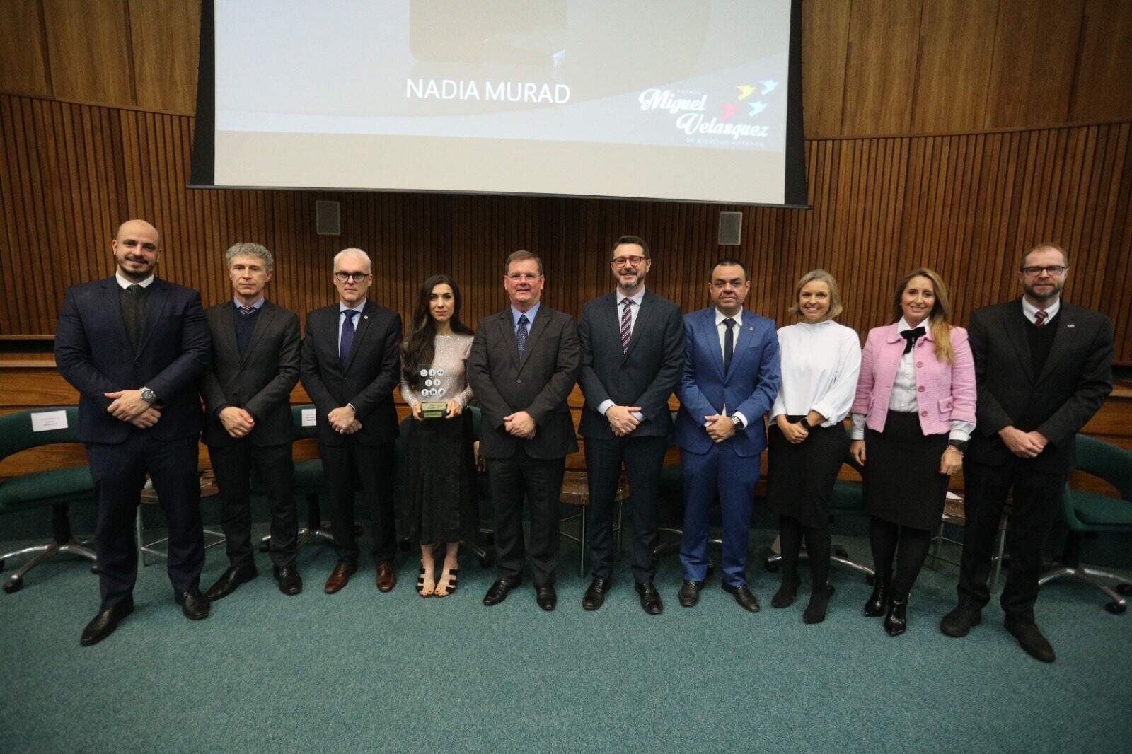 Ao final do painel, o procurador-geral de Justiça do Estado, Alexandre Saltz, realizou a entrega do Prêmio Miguel Velasquez de Direitos Humanos de 2023 à convidada. Instituída pelo Ministério Público do Estado em 2015, a honraria reconhece personalidades que se dedicam à defesa dos direitos humanos e à proteção da infância e da juventude.
