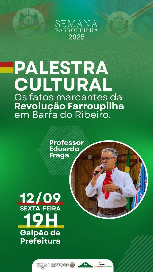 A Semana Farroupilha 2025 em Barra do Ribeiro terá como um de seus pontos altos a realização de uma palestra cultural que promete resgatar episódios históricos ligados à Revolução Farroupilha. O encontro será realizado na sexta-feira (12), às 19h, no Galpão da Prefeitura, e terá como palestrante o professor Eduardo Fraga.