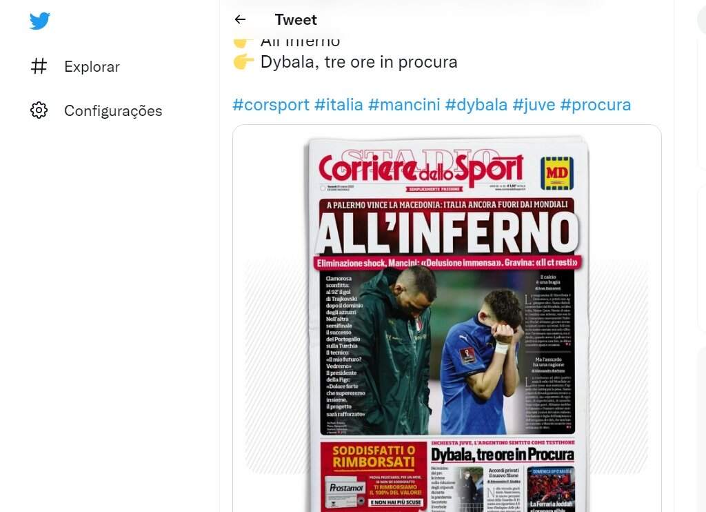 A chocante eliminação da Itália na repescagem para a disputa da Copa do Mundo do Catar foi retratada pela imprensa do país com espanto e tristeza. Os italianos, atuais campeões europeus, perderam para a Macedônia do Norte com um gol no final da partida e os jornais italianos trataram a derrota com surpresa e lamentação.