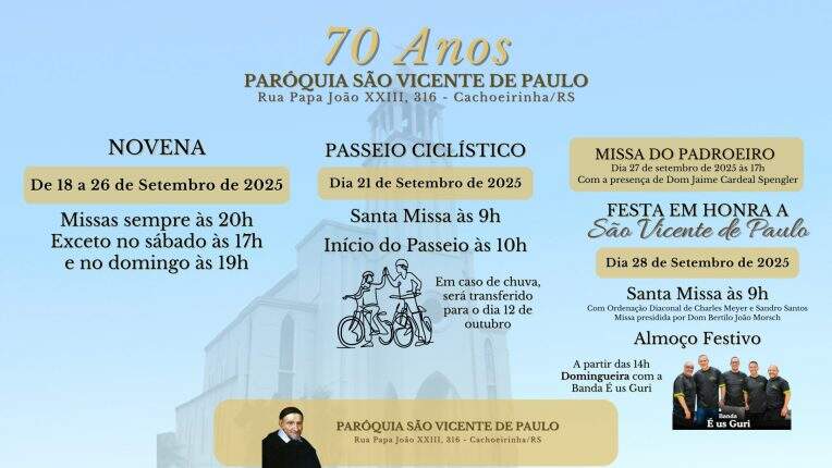 A Paróquia São Vicente de Paulo prepara uma grande festa no dia 28 deste mês em alusão aos 70 anos de atuação na comunidade de Cachoeirinha, na Região Metropolitana de Porto Alegre.