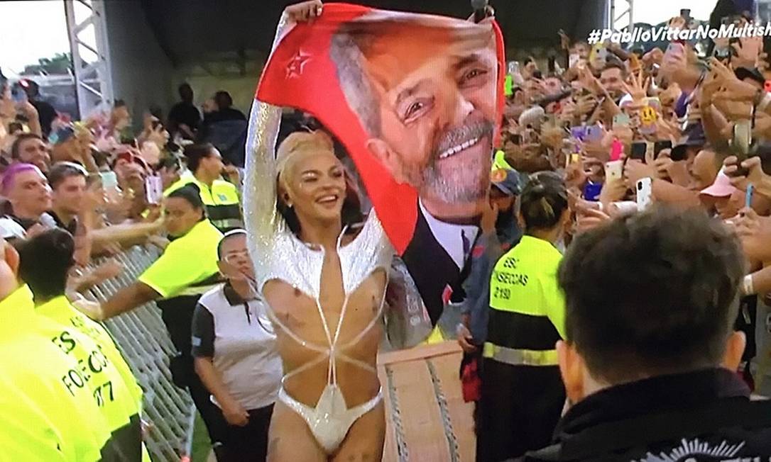 No show realizado na sexta-feira, Pabllo entoou um coro de “Fora Bolsonaro” e levantou uma toalha com o rosto do ex-presidente Lula enquanto andava pela passarela do local.