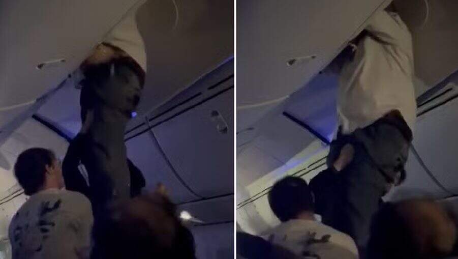 Um vídeo gravado logo após a turbulência mostra dois homens ajudando um passageiro preso no teto da aeronave a descer.