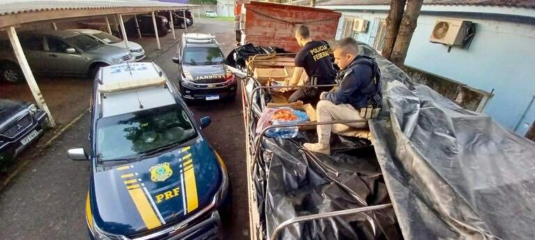 Na madrugada desta terça-feira (17), em uma ação conjunta da Polícia Rodoviária Federal e da Polícia Federal, foi apreendido um caminhão carregado com 5 toneladas de camarão contrabandeados da Argentina, na BR 285 em Passo Fundo. Uma Jeep Compass acompanhava a carga e o seu motorista fazia a escolta armada da mercadoria. Os dois homens foram presos por contrabando.