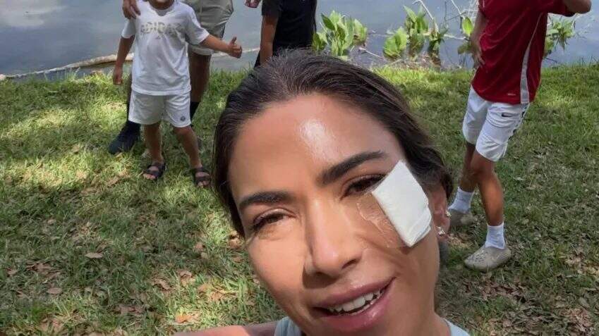 A famosa surgiu à beira de um lago com os filhos e o marido, o deputado Fábio Faria, 48, usando um grande curativo na região da bochecha. O detalhe não passou despercebido por uma seguidora, que questionou: “O que aconteceu com o seu rosto?”. A comunicadora prontamente respondeu: “Machuquei jogando golfe”.