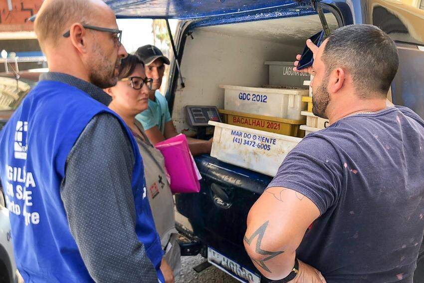 A Guarda Municipal acionou a Vigilância Sanitária após verificação de veículo com pescados no Centro da cidade. O Departamento Municipal de Limpeza Urbana também autuou por eliminar água do pescado em via pública, o que é considerado infração.