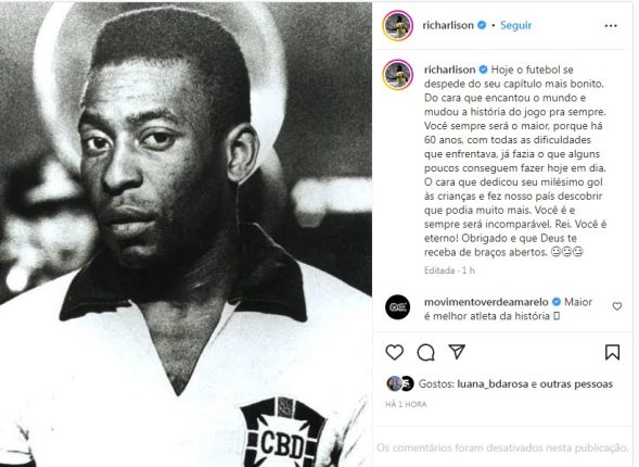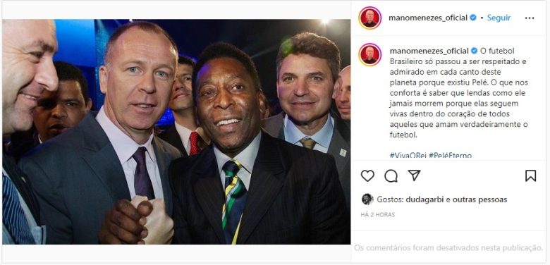 Hoje o Brasil dá adeus a um de seus filhos mais ilustres: Pelé, o rei do futebol. Eleito o atleta do século, Edson Arantes do Nascimento fez o mundo se curvar diante do seu talento, levando o futebol brasileiro ao altar dos deuses. pic.twitter.com/UBcHttRPcZ