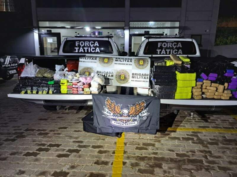 Foi dada voz de prisão a uma mulher, que foi conduzida até a delegacia. Foi preciso duas viaturas da Brigada Militar para levar a grande quantidade de drogas embora do local.