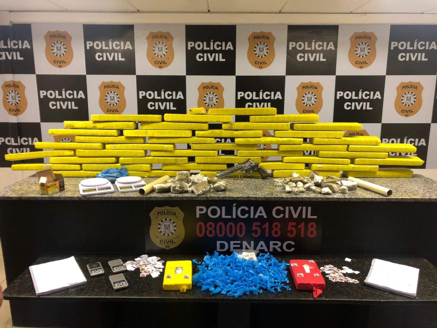 Dentro da casa foram localizados e apreendidos 45 kg de maconha, 2,495 kg de cocaína, parte já embalada em diversas porções, além de um revólver calibre.38, anotações de tráfico, além de material comumente utilizado para embalar drogas.