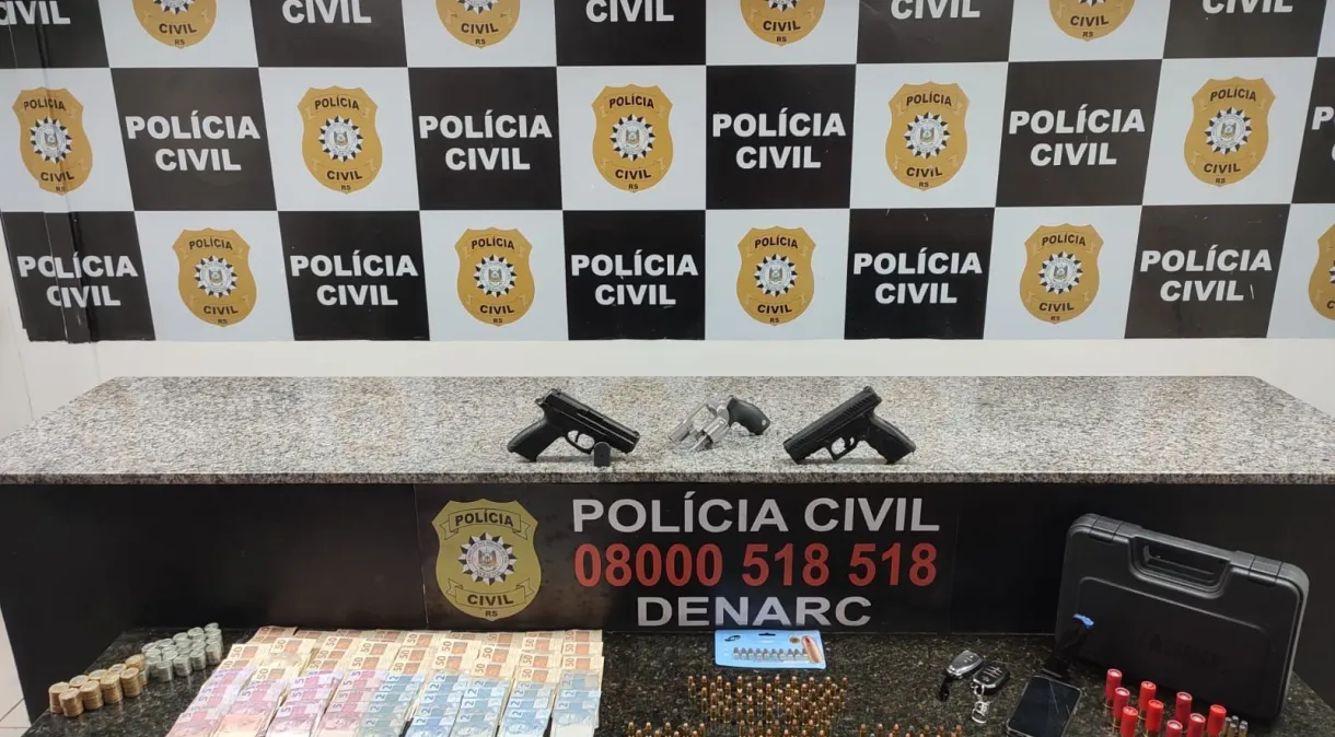Na residência de Cachoeirinha, um homem de 41 anos, com antecedente por homicídio qualificado, foi preso por porte ilegal de duas armas de fogo, além de munições. No local, os agentes encontraram duas pistolas e um revólver de uso restrito. Além do armamento, foram encontrados mais de R$ 2 mil em espécie e dois carros de luxo, avaliados em mais de R$ 350 mil.