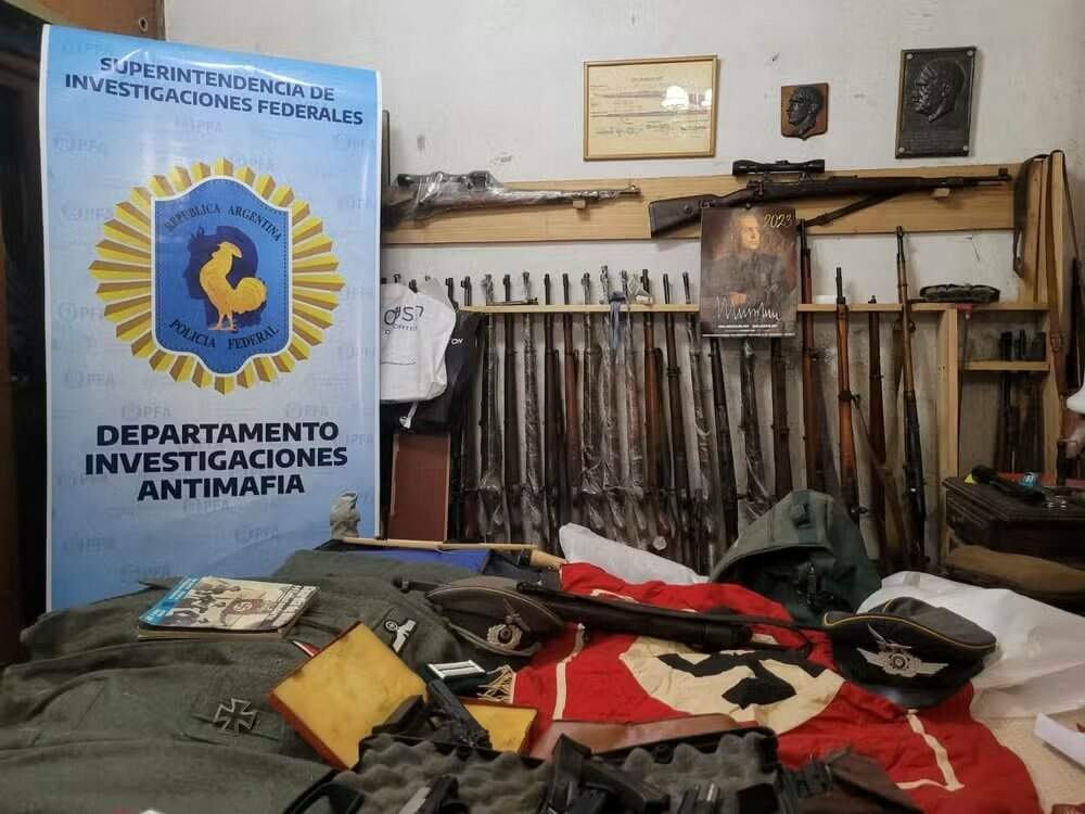 Mais de 60 armas de fogo foram encontradas na casa do suspeito, incluindo 43 rifles estampados com marcas de águia nazista, 15 pistolas, cinco baionetas e uma metralhadora. Ainda de acordo com um relatório da polícia argentina, bandeiras nazistas, uniformes militares, chapéus, capacetes, e bustos de Hitler também foram confiscados pelas autoridades.