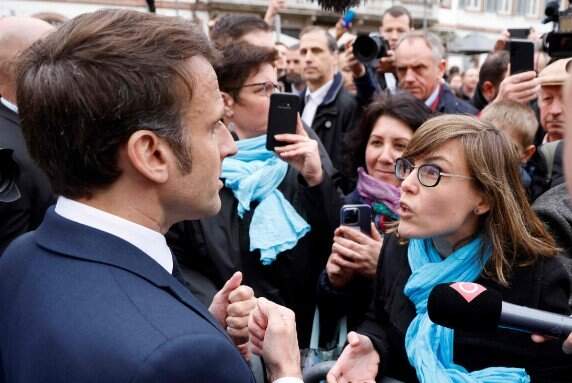 Uma mulher discordou de como Macron forçou as mudanças no Parlamento, chamando-o de antidemocrático. O presidente respondeu, sorrindo, que não renunciará. E ouviu uma tréplica: “Você não se importa mesmo com o que as pessoas querem”.
