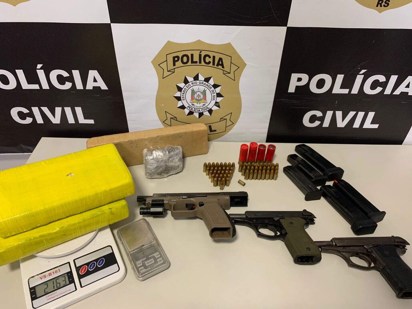 Na tarde de terça-feira (27), foram realizadas buscas em imóveis localizados no bairro Nonoai, na Zona Sul de Porto Alegre, e no bairro Vera Cruz, em Gravataí. Os policiais apreenderam três pistolas, mais de dois quilos de cocaína, um quilo de maconha, balanças de precisão e um drone avaliado em cerca de R$ 50 mil.
