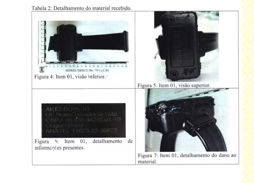 De acordo com o laudo elaborado pelo Instituto Nacional de Criminalística da PF, a tornozeleira apresentou deformações, fusão do material plástico e rompimento da capa protetora em diferentes pontos, inclusive com abertura suficiente para expor componentes internos. As regiões mais danificadas ficam na porção inferior e em uma das laterais do equipamento, o que indica aplicação reiterada de calor em pontos distintos.