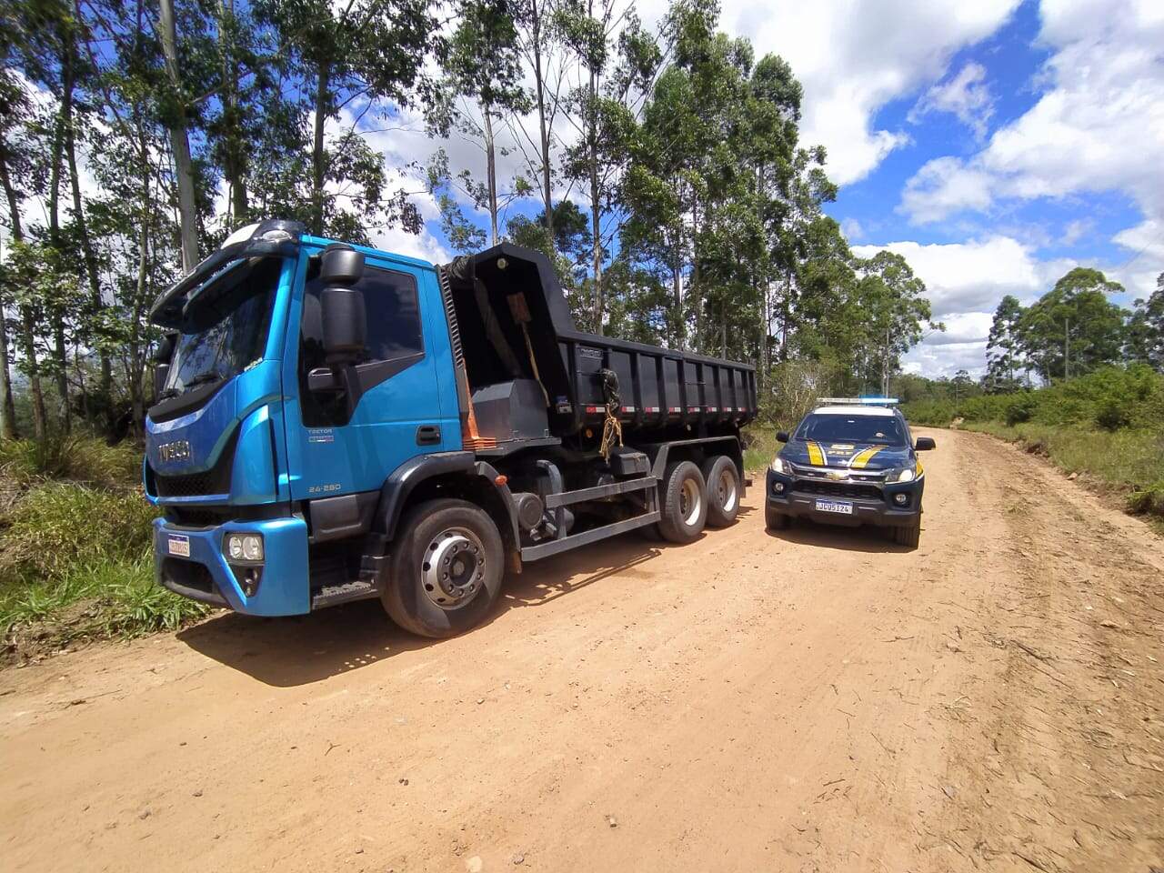 Durante operação de combate ao crime, os agentes receberam denúncia de que no interior do município de Triunfo dois indivíduos fizeram refém o motorista de um caminhão IVECO, obrigando-o a carregá-lo com uma retroescavadeira New Holland e se evadir do local pela rodovia BR-470.
