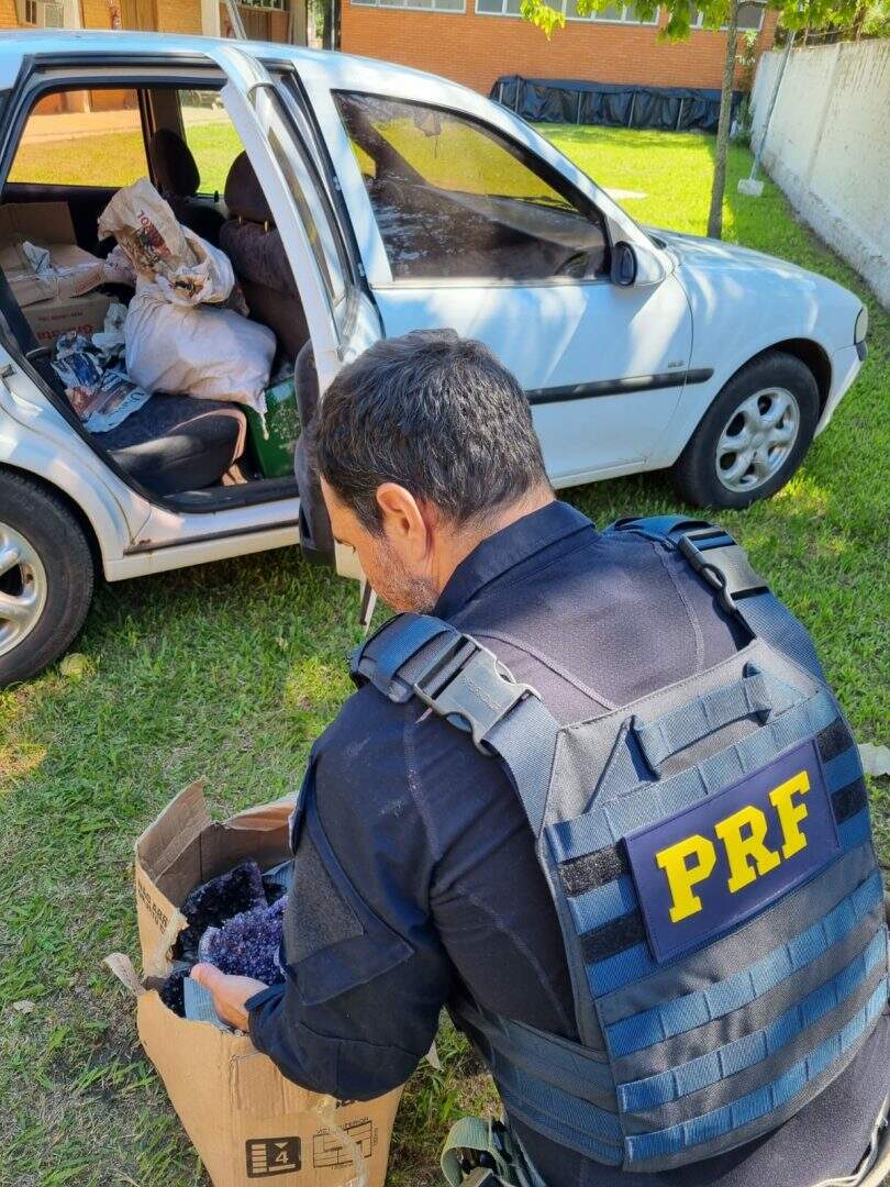 Na tarde desta segunda-feira (21), na BR-293 em Quaraí, na Fronteira Oeste do Estado, a Polícia Rodoviária Federal (PRF) apreendeu um carro carregado com ametistas importadas ilegalmente.