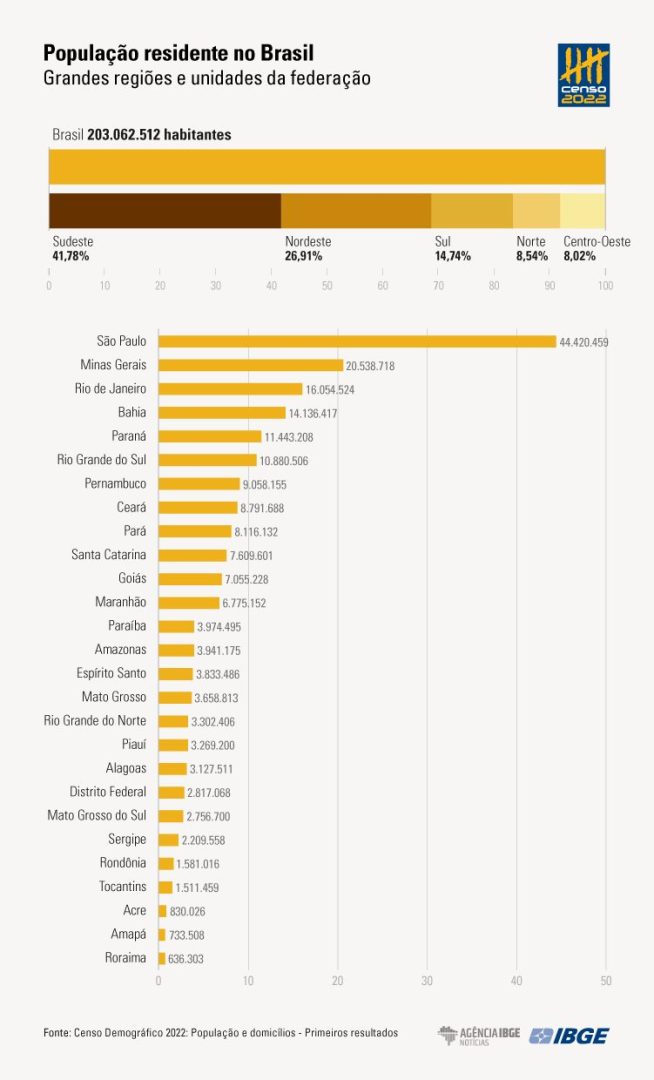 São Paulo, Minas Gerais e Rio de Janeiro seguem sendo os Estados mais populosos do Brasil. Juntos, os três concentram 39,9% da população brasileira. São Paulo, o maior deles em termos de população, tem 44.420.459 habitantes.