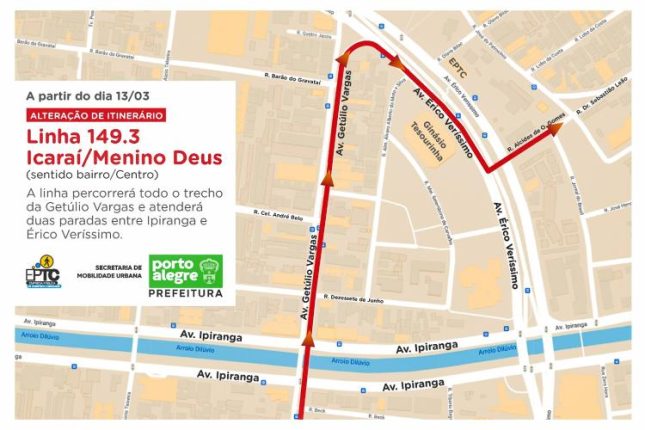 A rota 149.3, na região Centro-Sul, terá alteração no itinerário no sentido bairro/Centro. O transporte coletivo passará pela avenida Getúlio Vargas até a Érico Veríssimo, no sentido bairro/Centro.