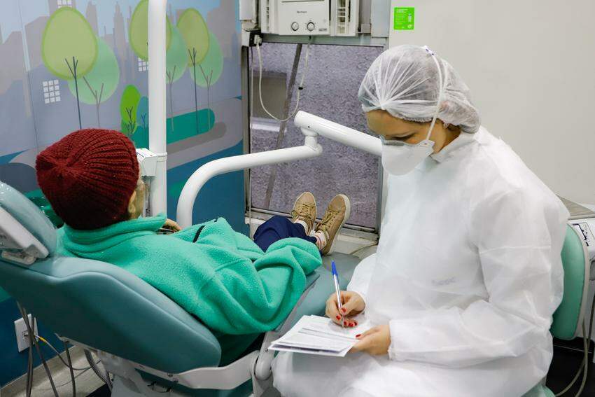 Com 76 anos, dona Dirce Alves Dalolmo foi uma das primeiras pacientes a receber atendimento nesta manhã, aguardado desde maio de 2021. “Usar a prótese melhora em tudo, para sorrir, se alimentar, conversar”, comenta ela, que perdeu um dente e vai trocar o aparelho protético antigo, pois já não serve mais.