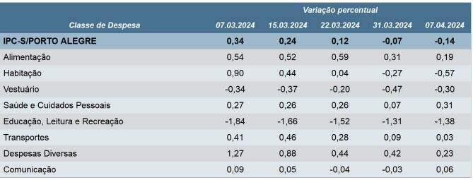 O IPC-S (Índice de Preços ao Consumidor – Semanal) recuou para -0,14% na primeira semana deste mês em Porto Alegre, de acordo com dados divulgados pela FGV (Fundação Getulio Vargas). Na semana anterior, o índice havia ficado em -0,07%.