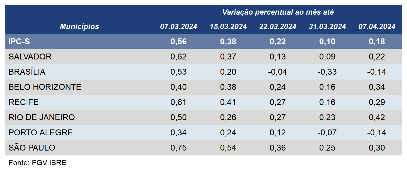 Nesta apuração, cinco das oito classes de despesa componentes do IPC-S apresentaram desaceleração em suas taxas de variação, entre as quais se destacam os grupos habitação e despesas diversas, cujas taxas passaram de -0,27% para -0,57% e de 0,42% para 0,23%, respectivamente. O grupo alimentação recuou de 0,31% para 0,19%.