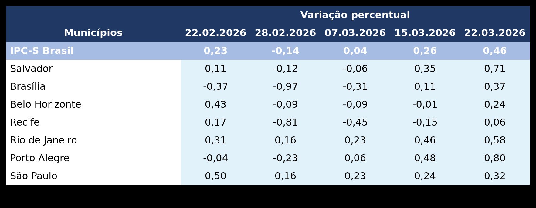 No País, o IPC-S subiu de 0,26% para 0,46%. Com esse resultado, o indicador acumula variação de 3,25% nos últimos 12 meses.