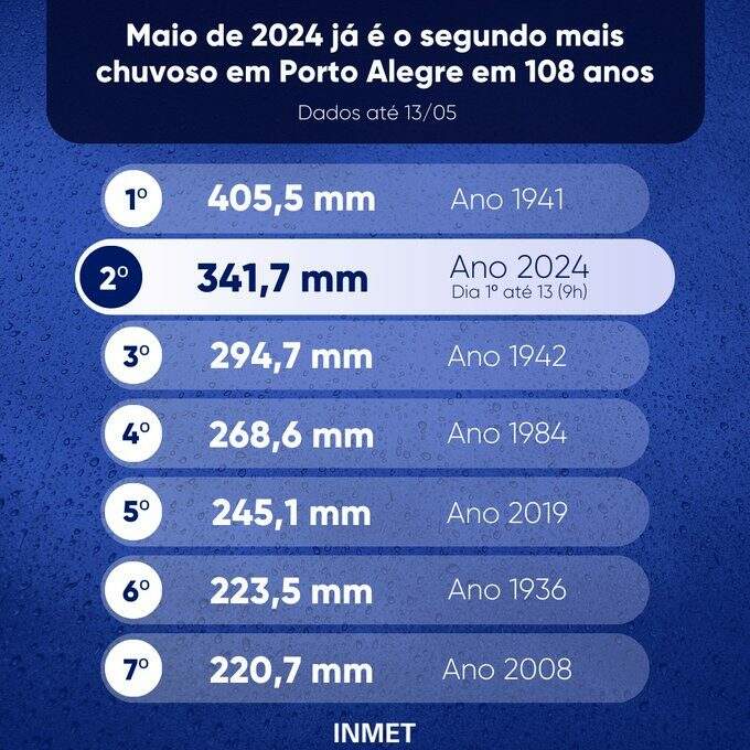 Porto Alegre registra em 2024 o segundo mês de maio mais chuvoso da história. Segundo dados do Inmet (Instituto Nacional de Meteorologia), o volume de chuva neste mês na Capital gaúcha somou cerca de 350 milímetros até segunda-feira (13).