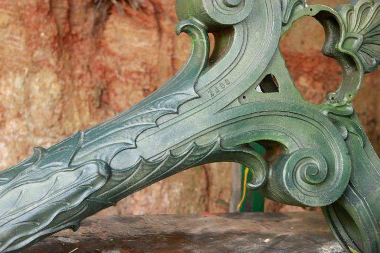 O padrão clássico do material apresenta no topo folhas de acanto, volutas e campânulas que sustentam as tocheiras. As estruturas foram fabricadas por uma empresa com sede em Ohio em 1929.