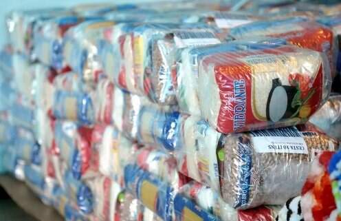 Alimentos como arroz, feijão, café, farinha de trigo, lentilha, bolacha, massa, molho de tomate, açúcar, leite em pó, achocolatado, leite em embalagem tetra pak.