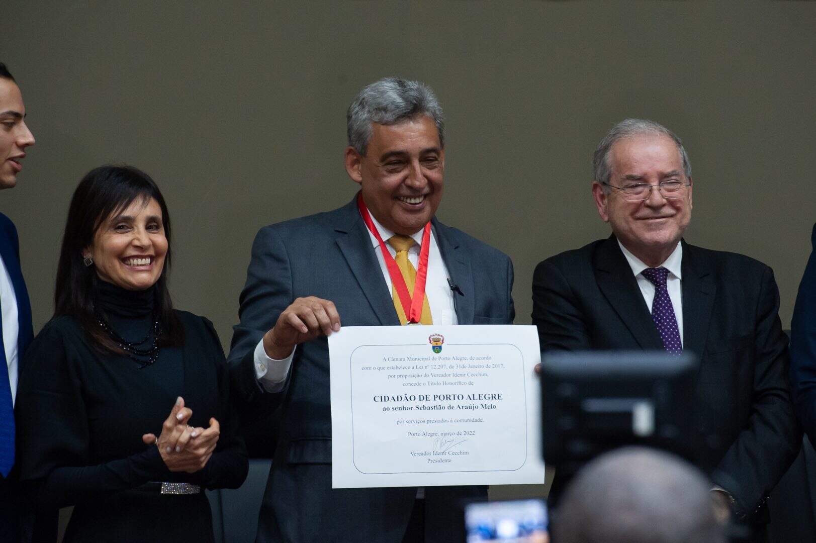A Câmara Municipal entregou, na noite desta terça-feira (30), o título de Cidadão de Porto Alegre ao prefeito Sebastião Melo. A outorga foi proposta pelo presidente do Legislativo, vereador Idenir Cecchim (MDB). O evento foi realizado no Plenário Otávio Rocha.