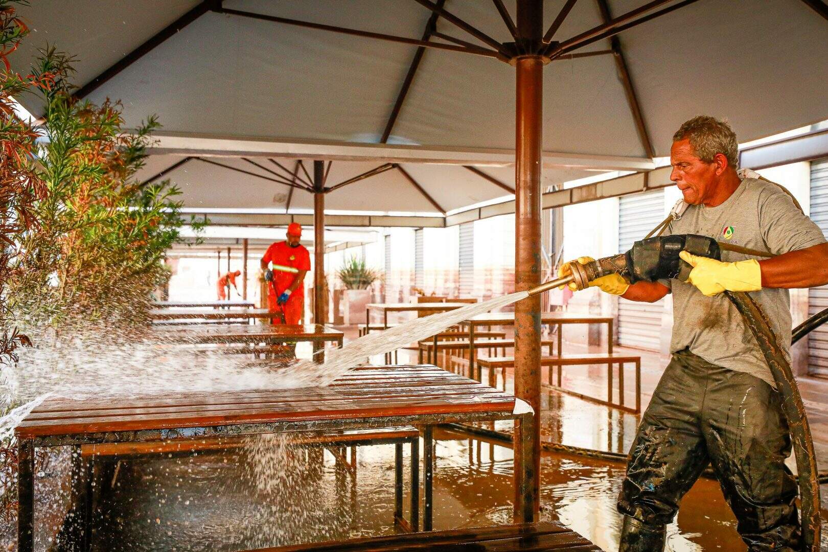 A prefeitura solicita a colaboração dos lojistas para que deixem os descartes resultantes da limpeza dos estabelecimentos comerciais do lado de fora, facilitando o recolhimento pelas equipes de limpeza. Ao todo, são mais de 800 trabalhadores atuando na remoção de entulhos pós-enchente nas áreas já secas.