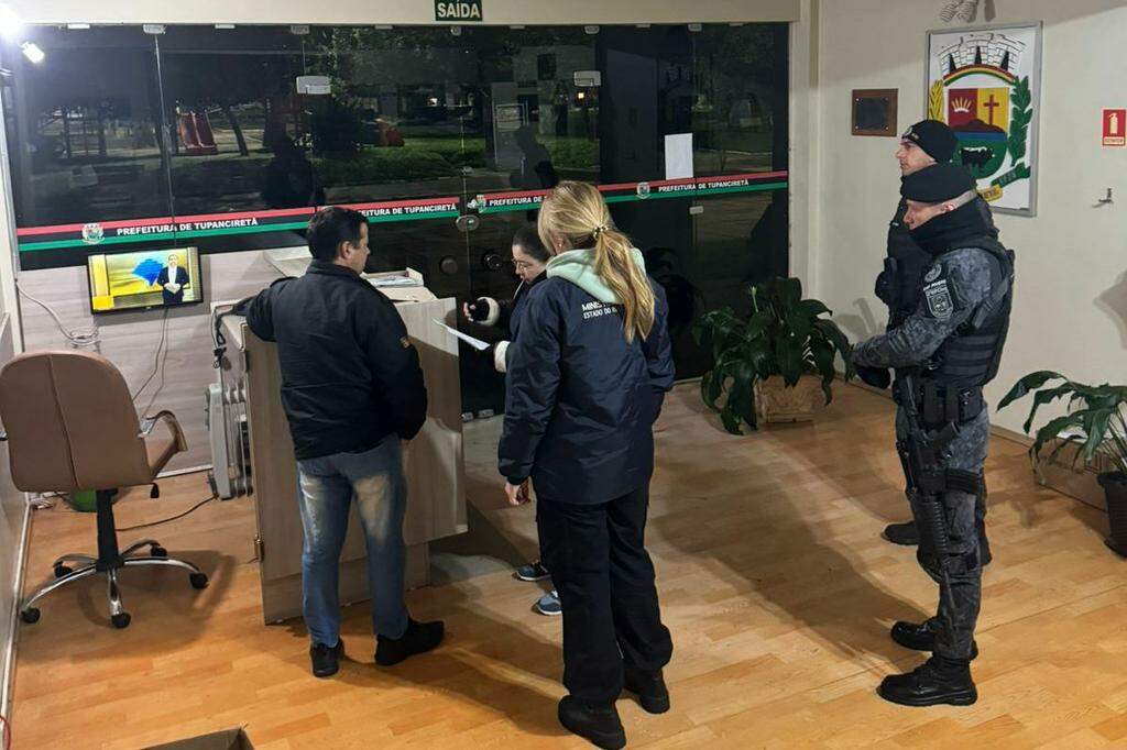 Com o apoio da Brigada Militar, o MP (Ministério Público) cumpriu, na manhã desta quinta-feira (11), mandados de busca e apreensão na sede da prefeitura de Tupanciretã, na Secretaria Municipal da Fazenda, na Procuradoria Jurídica, nas residências de agentes públicos da cidade e de um empresário e em empreendimentos em Novo Hamburgo.