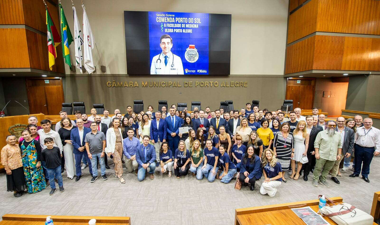 A Faculdade de Medicina da Ulbra Porto Alegre recebeu a Comenda Porto do Sol, a mais alta honraria da Câmara Municipal, em sessão realizada no Plenário Otávio Rocha. A homenagem, proposta pelo vereador Alexandre Bobadra e aprovada por unanimidade, reconhece o papel da instituição na formação de médicos e cidadãos comprometidos com a comunidade. O vice-presidente João Pedro Melke destacou a disciplina de saúde da família presente em todos os semestres e os milhões de atendimentos já realizados. Para Bobadra, a Ulbra é referência pela estrutura moderna e corpo docente qualificado. O superintendente Ruy Irigaray lembrou que médicos egressos atuam em todo o país e em centros internacionais, reforçando o impacto da universidade.
