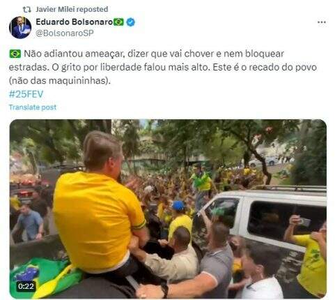 Uma das postagens reproduzidas por Milei foi a de Eduardo Bolsonaro (PL-SP), deputado federal e filho do ex-presidente brasileiro. Na mensagem, Eduardo disse que o grito por liberdade falou mais alto.