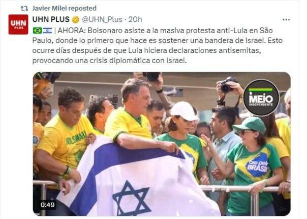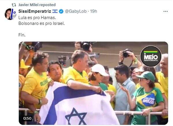 Milei já havia demonstrado proximidade com Jair Bolsonaro e o filho após a vitória nas eleições argentinas, quando o trio participou de uma videoconferência de comemoração. O presidente argentino também compartilhou uma postagem que associa o presidente Luiz Inácio Lula da Silva ao Hamas.