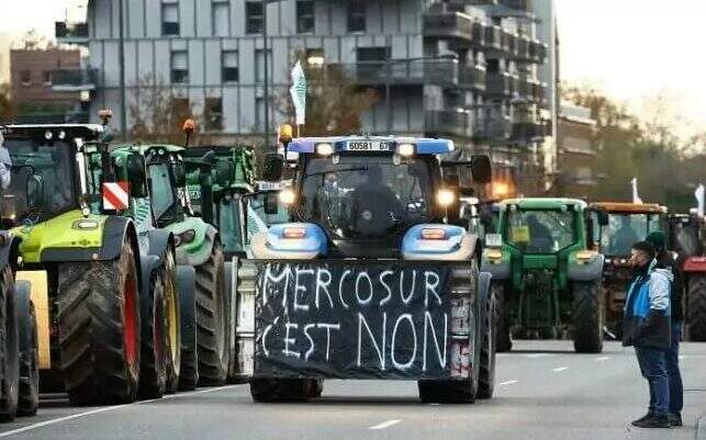 Na quinta-feira, Bruxelas, sede da União Europeia, foi tomada por protestos violentos de agricultores europeus contra o acordo. Segundo a polícia de Bruxelas, 7.300 pessoas com cerca de 50 tratores participaram do protesto autorizado, a maioria pacificamente. Mas outros 950 tratores chegaram ao bairro europeu, bloqueando várias ruas, com registro de vários incidentes.