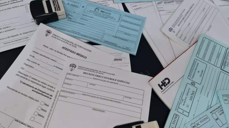 Quando das buscas, o que chamou a atenção dos policiais foi a localização de inúmeros receituários e atestados médicos em branco, somente com o carimbo de profissionais da saúde.
