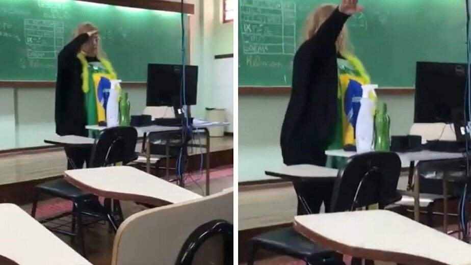 No vídeo, divulgado pela Revista Fórum, é possível ver o momento em que ela leva a mão à testa, como em posição de sentido, e depois estende o braço, conforme o gesto adotado pelos nazistas para saudar Adolf Hitler.