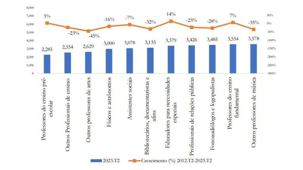 O rendimento médio dos professores de pré-escola, segundo a pesquisa, é de R$ 2.285 mensais. Na sequência, aparecem outros profissionais de ensino, com salários de R$ 2.554, além de professores de artes, de música e do ensino fundamental.