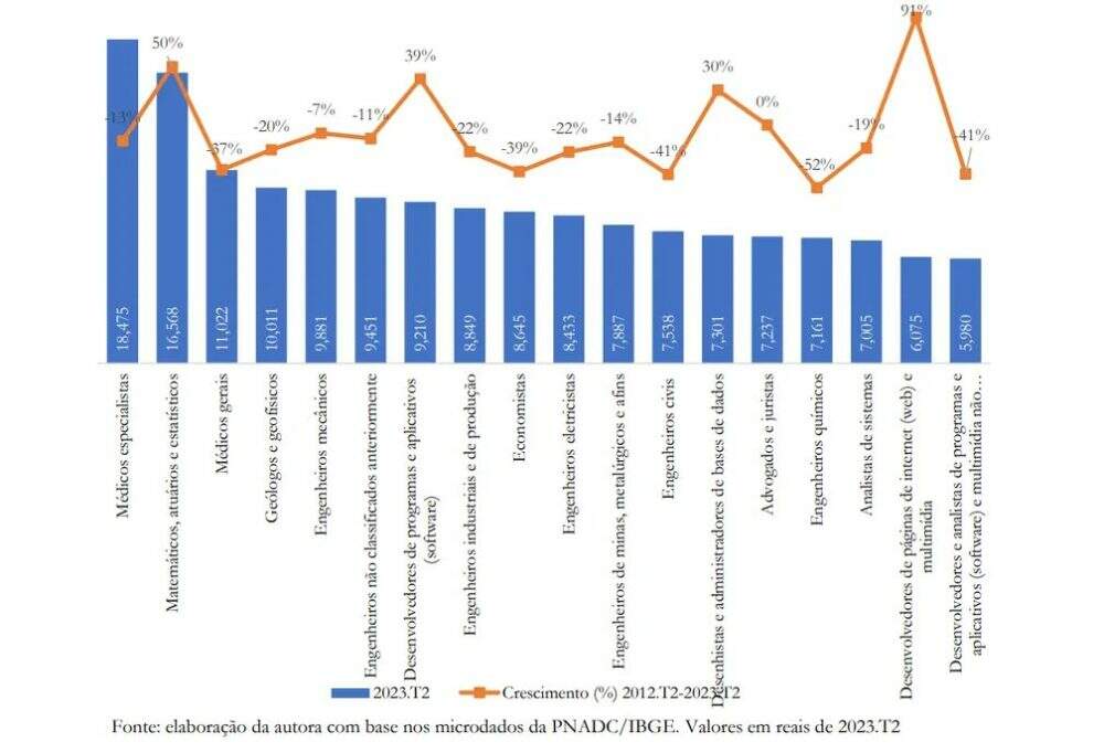 Já o ranking das ocupações mais bem pagas inclui médicos especialistas, com salários de mais de R$ 18 mil, matemáticos, geólogos, engenheiros mecânicos e desenvolvedores de software.