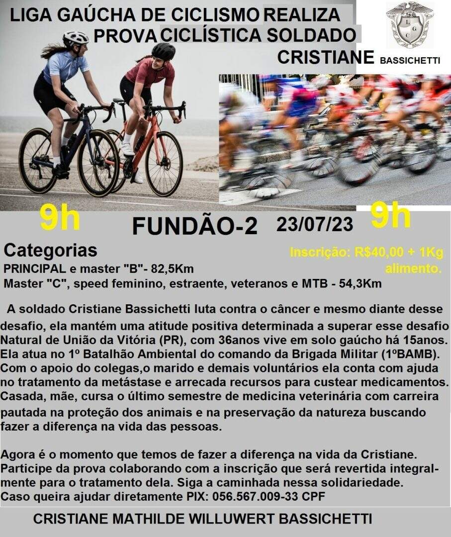 A Liga Gaúcha de Ciclismo realizará no domingo (23), no distrito de Itapuã, em Viamão, na Região Metropolitana de Porto Alegre, uma prova em prol da soldado Cristiane Bassichetti, do 1º Batalhão Ambiental da Brigada Militar, que luta contra um câncer agressivo.