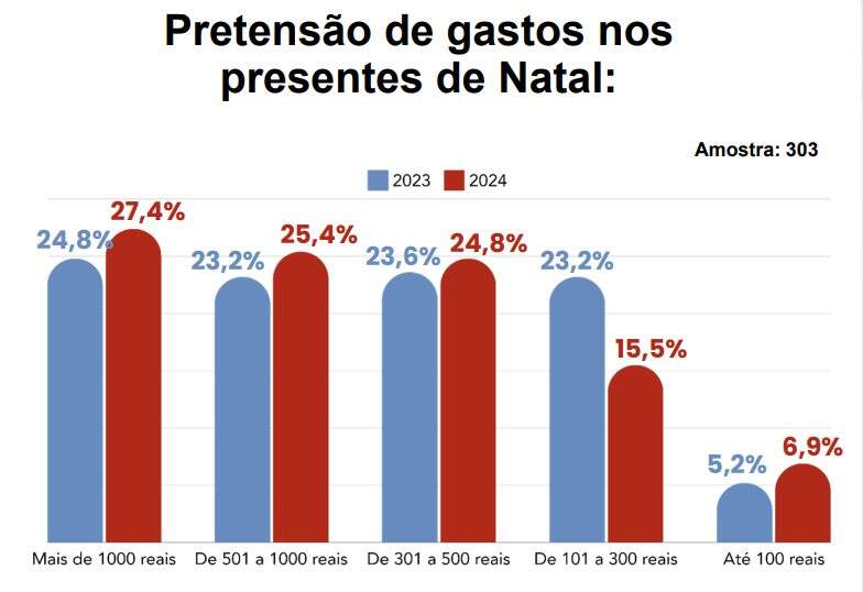 Em 2024, as compras serão realizadas um mês antes do Natal por 32% das pessoas, ante 38,4% no ano anterior. As intenções de compra na semana do Natal aumentaram de 18,8% para 22,1%; na véspera, de 2,8% para 4,6%; e no dia, de 0,8% para 1%. Também chama a atenção a elevação do número de consumidores que farão a aquisição de presentes após a data comemorativa: 3,3% em 2024 frente a 1,6% em 2023.