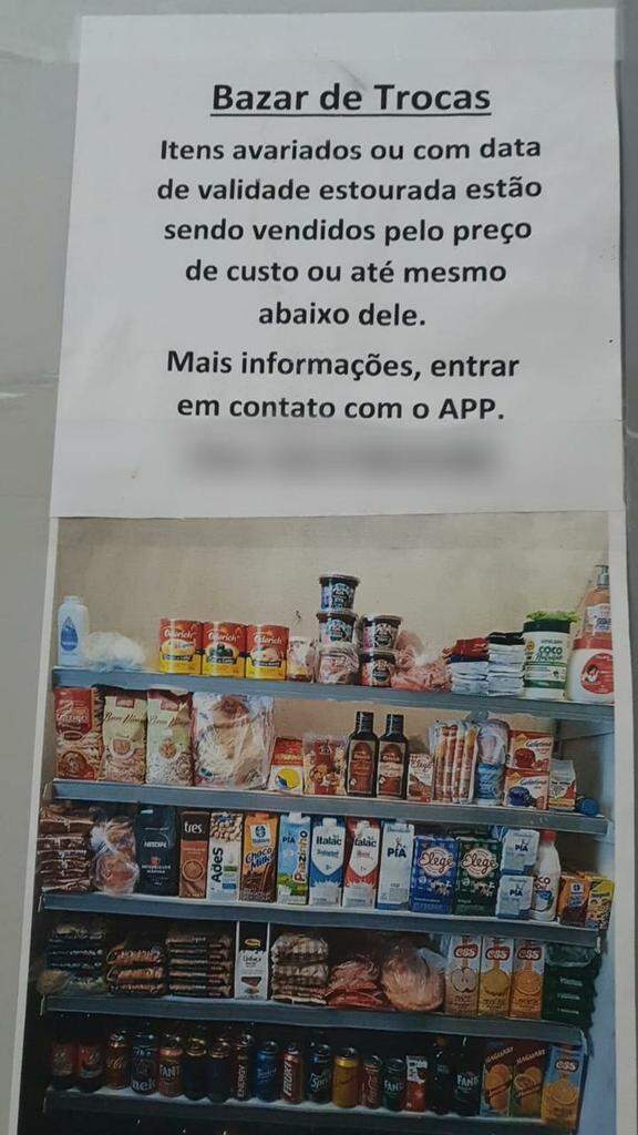 Em um dos mercados, havia um “bazar de troca”, onde itens avariados ou com a “data de validade estourada” eram vendidos “pelo preço de custo ou até mesmo abaixo dele”, segundo indicava um cartaz.