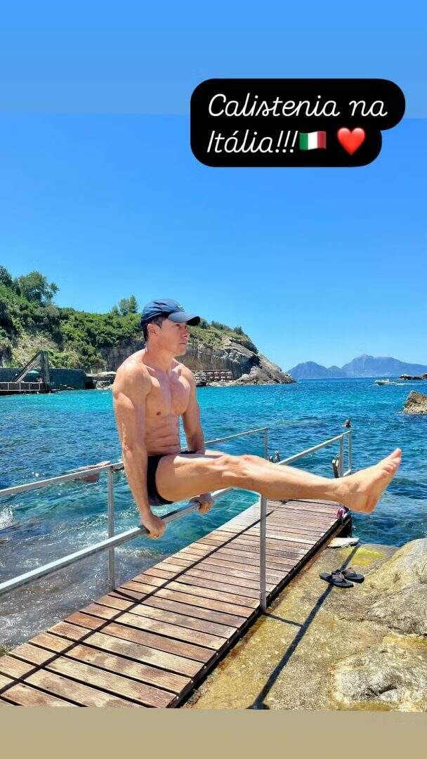 Rodrigo Faro, de 51 anos, impressionou seguidores ao mostrar a força que tem nos braços. O apresentador fez um exercício físico conhecido como calistenia em um corrimão de uma espécie de píer que leva a uma praia paradisíaca. O apresentador está curtindo férias com a esposa, Vera Viel, de 49, e as filha, Clara, de 20, e Maria, de 17, na Itália.